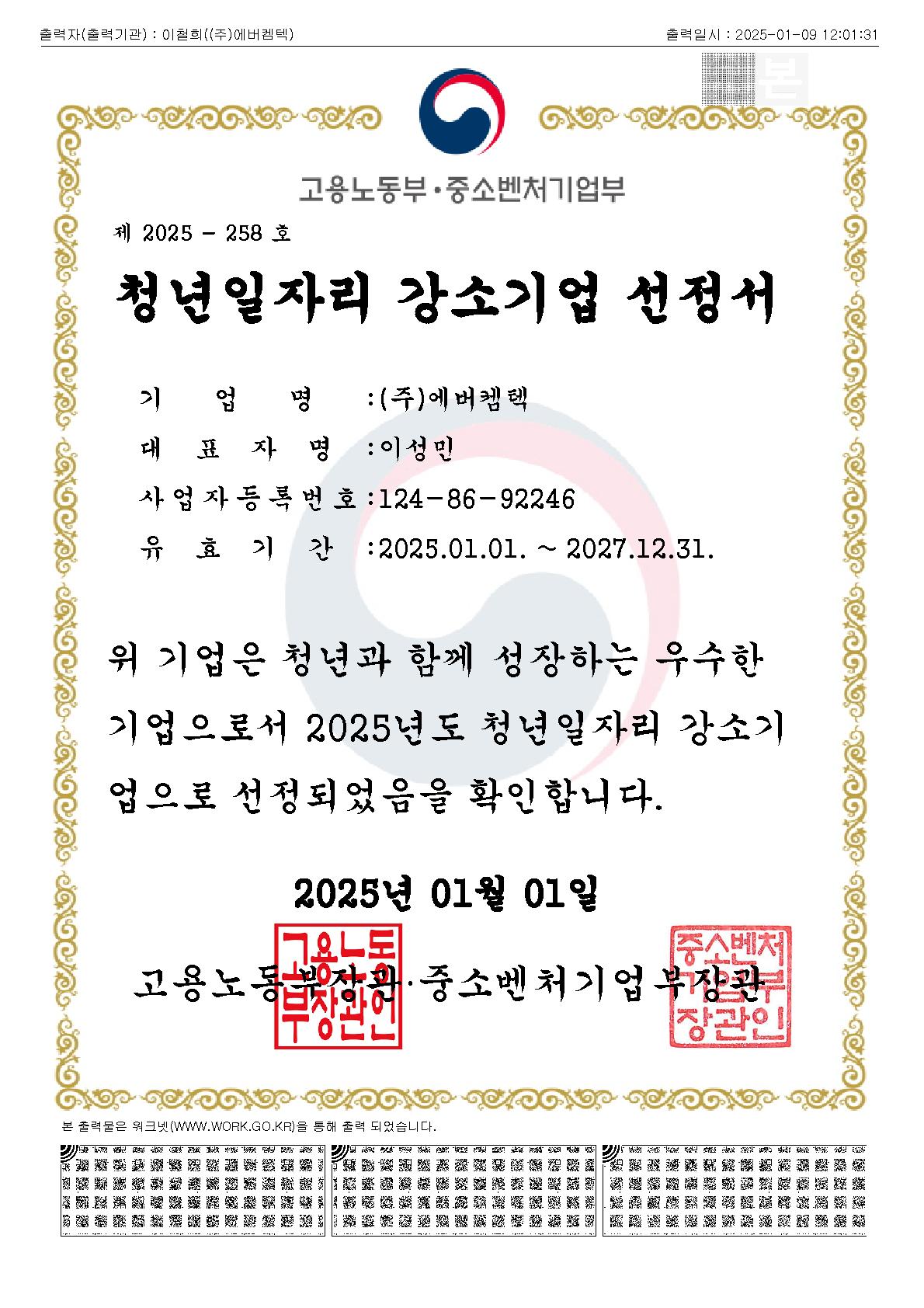 2025.01.01. (주)에버켐텍 청년일자리 강소기업 선정