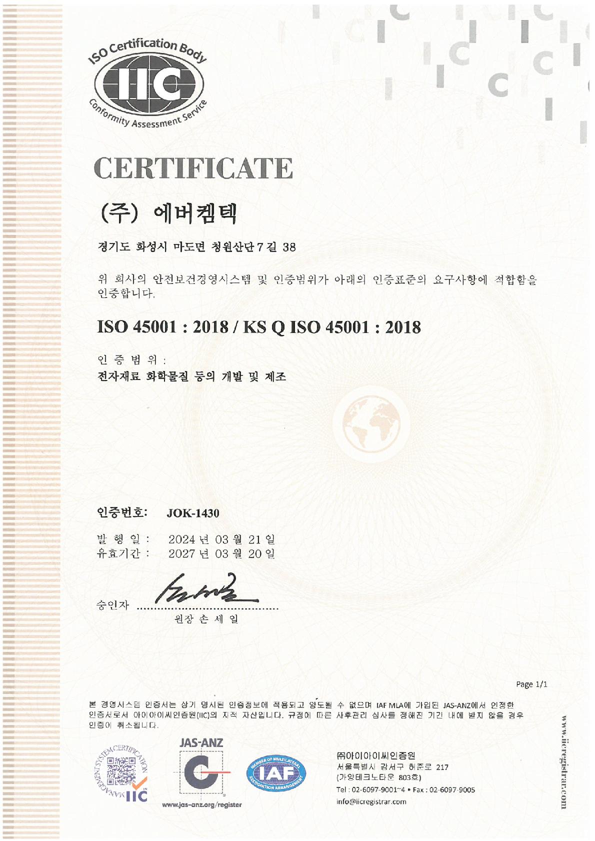 2024.03.21. (주)에버켐텍 ISO 45001(안전보건경영시스템) 인증 취득