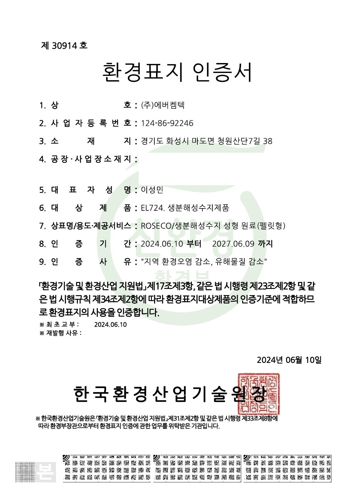 2024.06.10. (주)에버켐텍 EL724_ROSECO 생분해성수지제품_원료 환경표지인증 취득