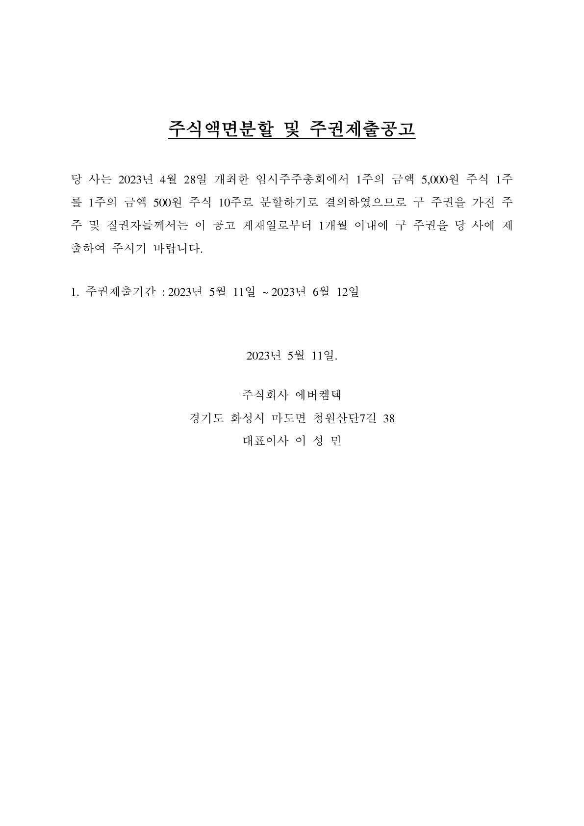 주식액면분할 및 주권제출공고 페이지 정보 작성자 EVERCHEMTECH 댓글 0건 조회 742회 작성일 23-05-11 09:57 목록 본문 이전글2023.05. NEXRIER 2023 WPO PRESIDENT'S AWARD 수상 23.08.02 다음글2022.12.30 신기술(NeT)인증 획득 23.05.11 댓글 0 댓글목록 등록된 댓글이 없습니다.