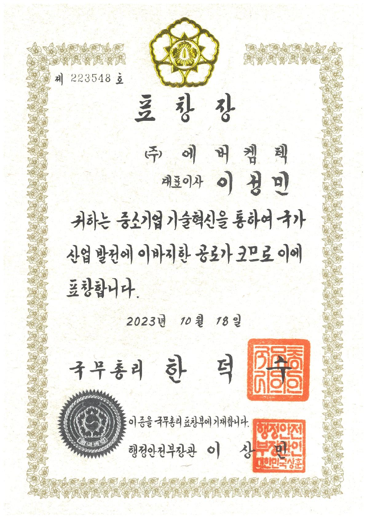 2023.10.18. 2023년 중소기업 기술혁신 유공포상_국무총리 표창 수상